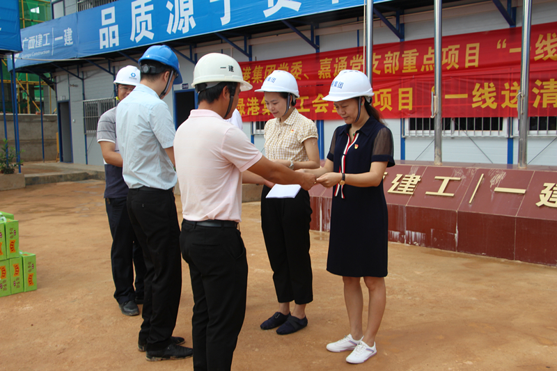 7月4日一早,集团慰问工作小组在集团公司副总经理陆羿冰、黄克和集团副总经理、工会主席黄丽琴的率领下,来到了吴圩镇“绿港·云海湾”项目工地。绿港•云海湾项目由嘉通公司重点打造的开发建设高端住宅社区,项目位于吴圩空港经济区的核心位置,项目总投资额3.8亿元,于今年3月正式启动。目前,项目商业区已开展基础施工,别墅区一期施工6栋已结构封顶,小高层区正在进行土方开挖工作。