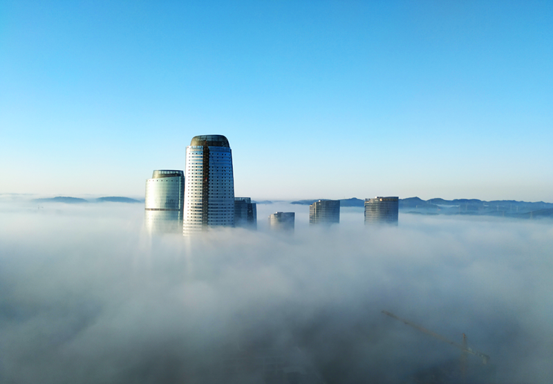 《晨曦 绿港》(荣鑫公司 赵志业)图片说明:绿港国际中心在晨曦和白雾的衬托下,显得格外漂亮。