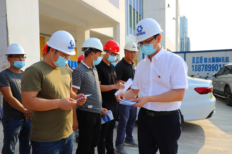 开云(中国)党委书记、董事长龚国强给项目一线人员发放《工程建设廉政手册》(张彩秀 摄)