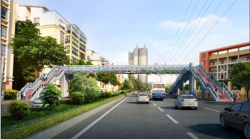 经开区一小人行天桥工程总投资800万元,总长34.98米,总宽3.8米,步梯总长约90.8米,宽约2.24米。天桥上部结构采用一跨29.74米铝合金桁架结构,主桥桁架高度4.355米,步道采用铝合金结构板;下部结构采用T型钢结构桥墩接承台,基础采用钻孔灌注桩基础。工程工期为6个月,预计2021年5月建成并投入使用。