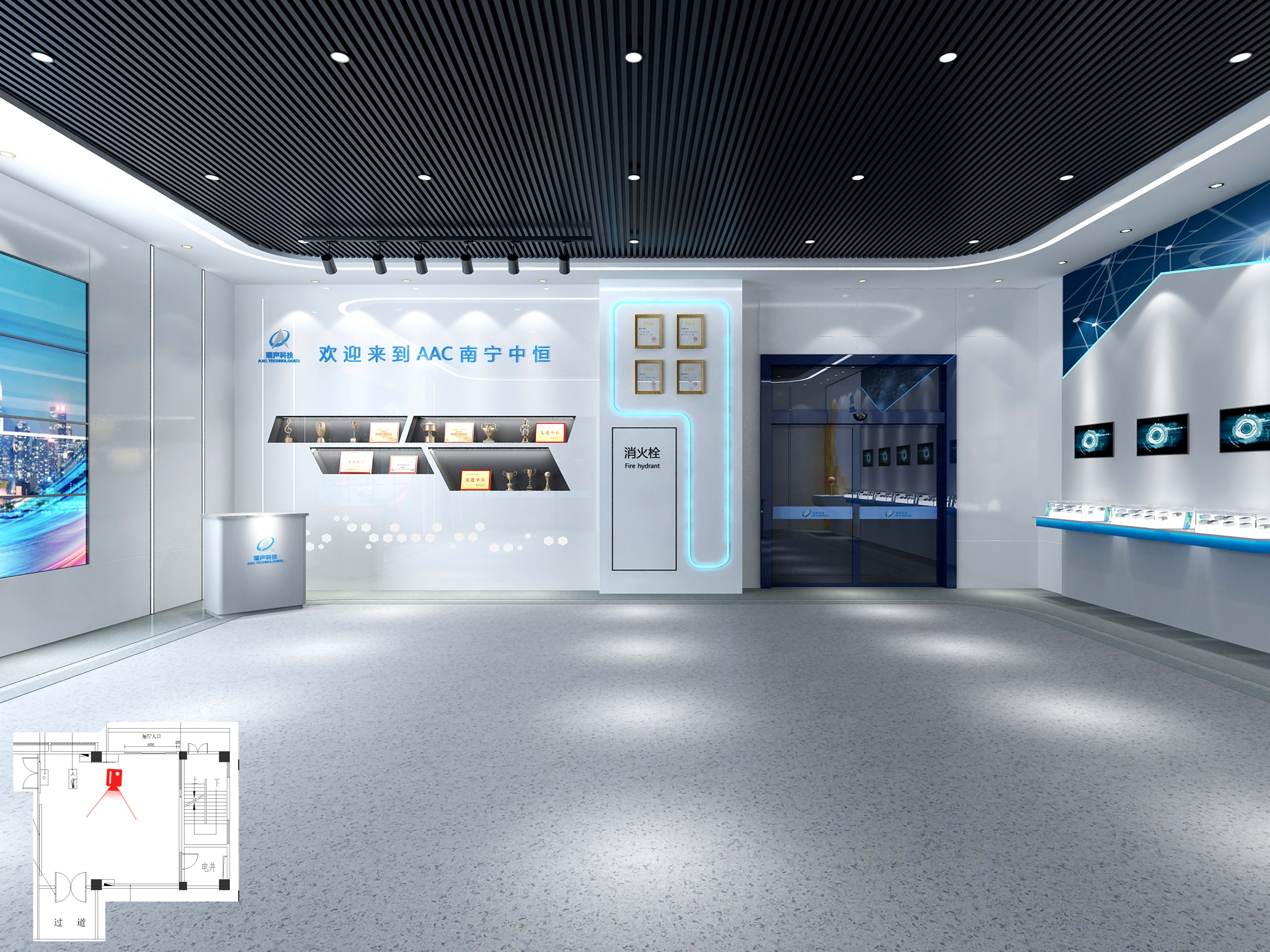 瑞声光学模组科技展厅由两个子展厅组成。此次科技展厅装修内容包括展厅外的市政设施改造、园林景观改造,还包括展厅内地面、墙面、天面装饰装修,给排水系统、消防系统改造、智能化系统等高标准的工作内容。